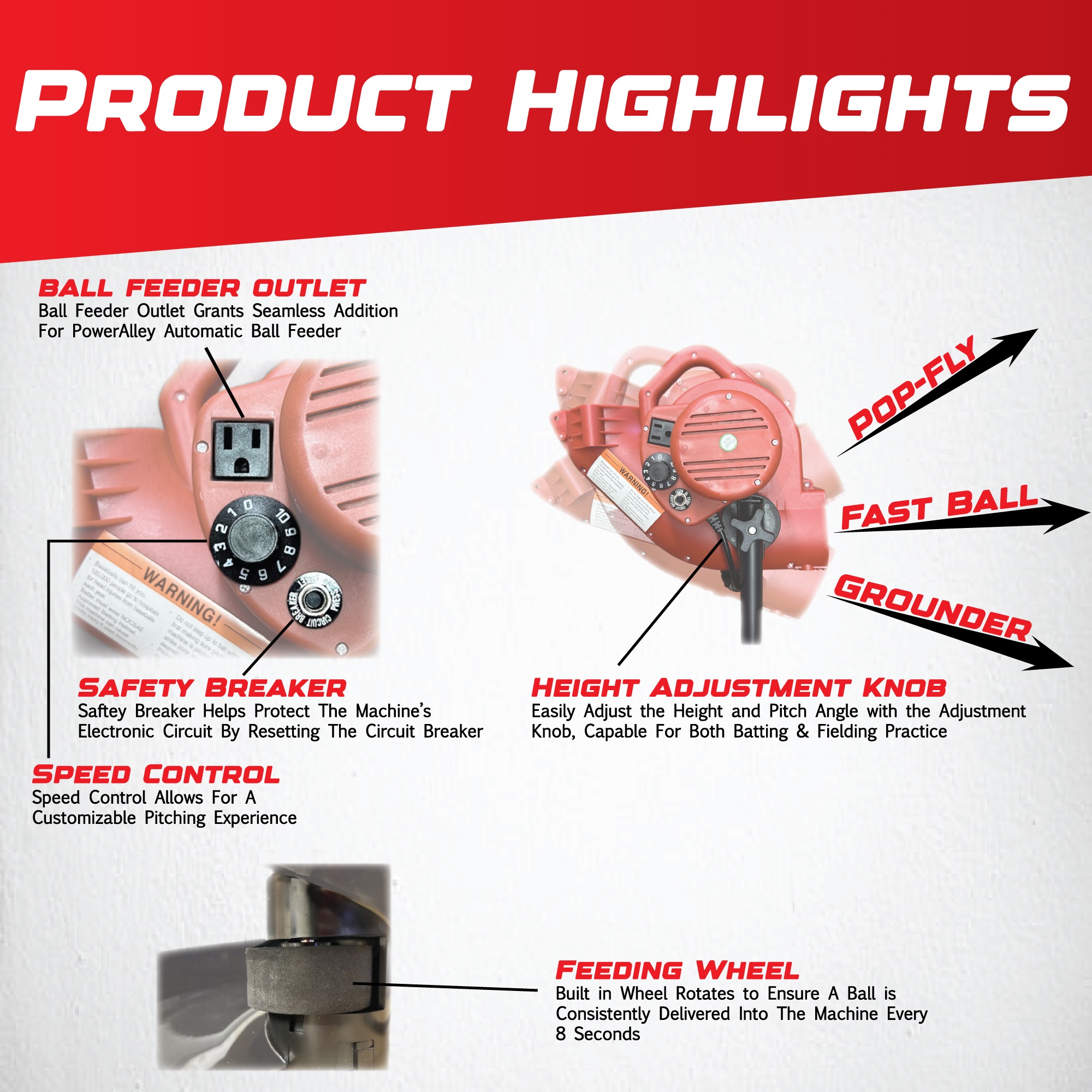 • Pitch Types: Fastballs, Pop Flies, Grounders (with adjustable pitch height)