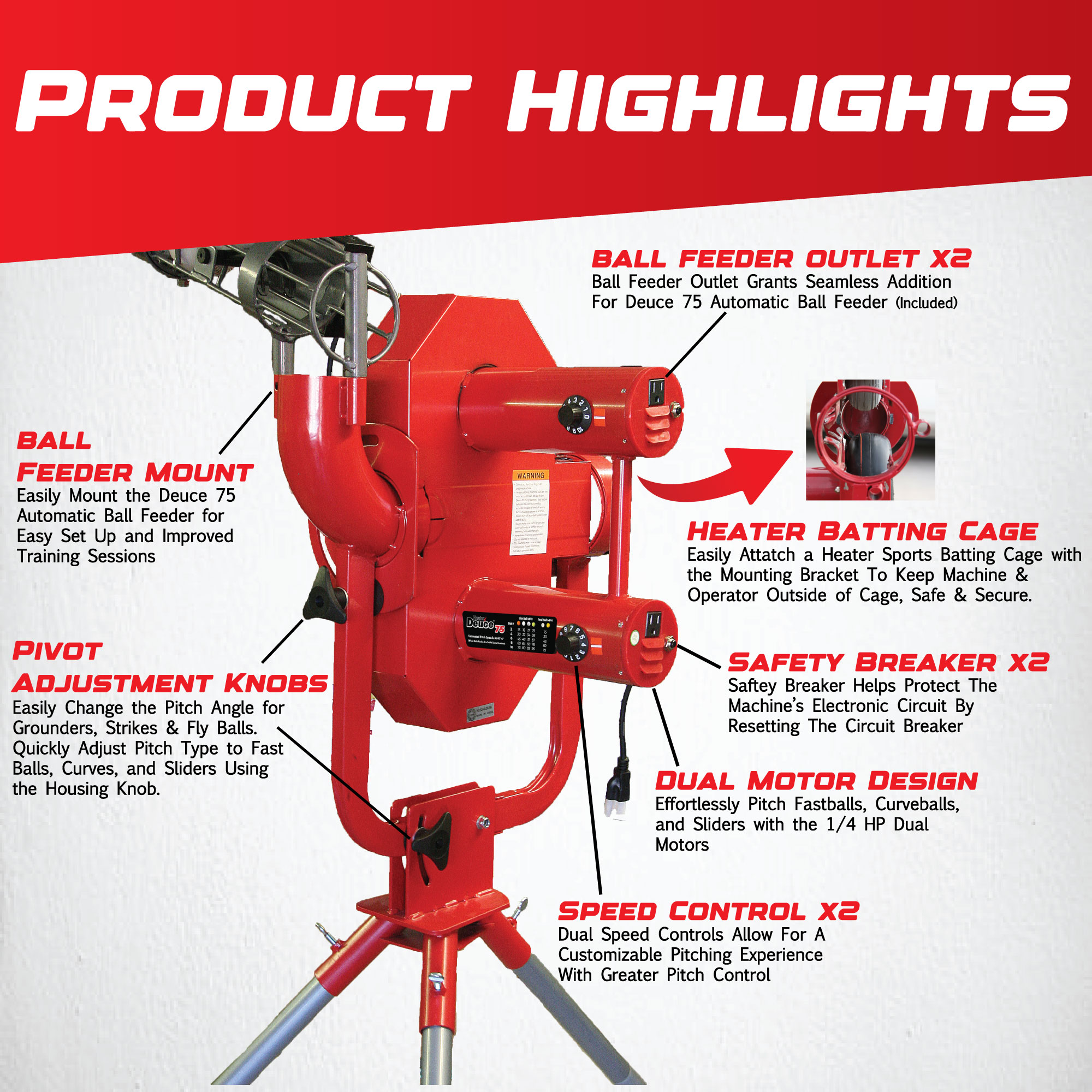 Take your game to a whole new level with the Deuce 2 Wheel Baseball Pitching Machine. With Heater Sports innovative Pivot-Head design you’ll be hitting outside breaking balls, inside breaking balls, and fastballs like a pro. The Deuce also includes an automatic ball feeder that holds 12 baseballs. The Deuce plugs directly into any standard wall outlet or third party battery packs may be available for convenience. Dual speed controls allow you to adjust each wheel independently for a variety of pitches at speeds of up to 75 MPH. Use the Deuce with the optional PowerAlley or Xtender Home Batting Cages and you’ll be hitting balls anytime you want right in your own backyard.