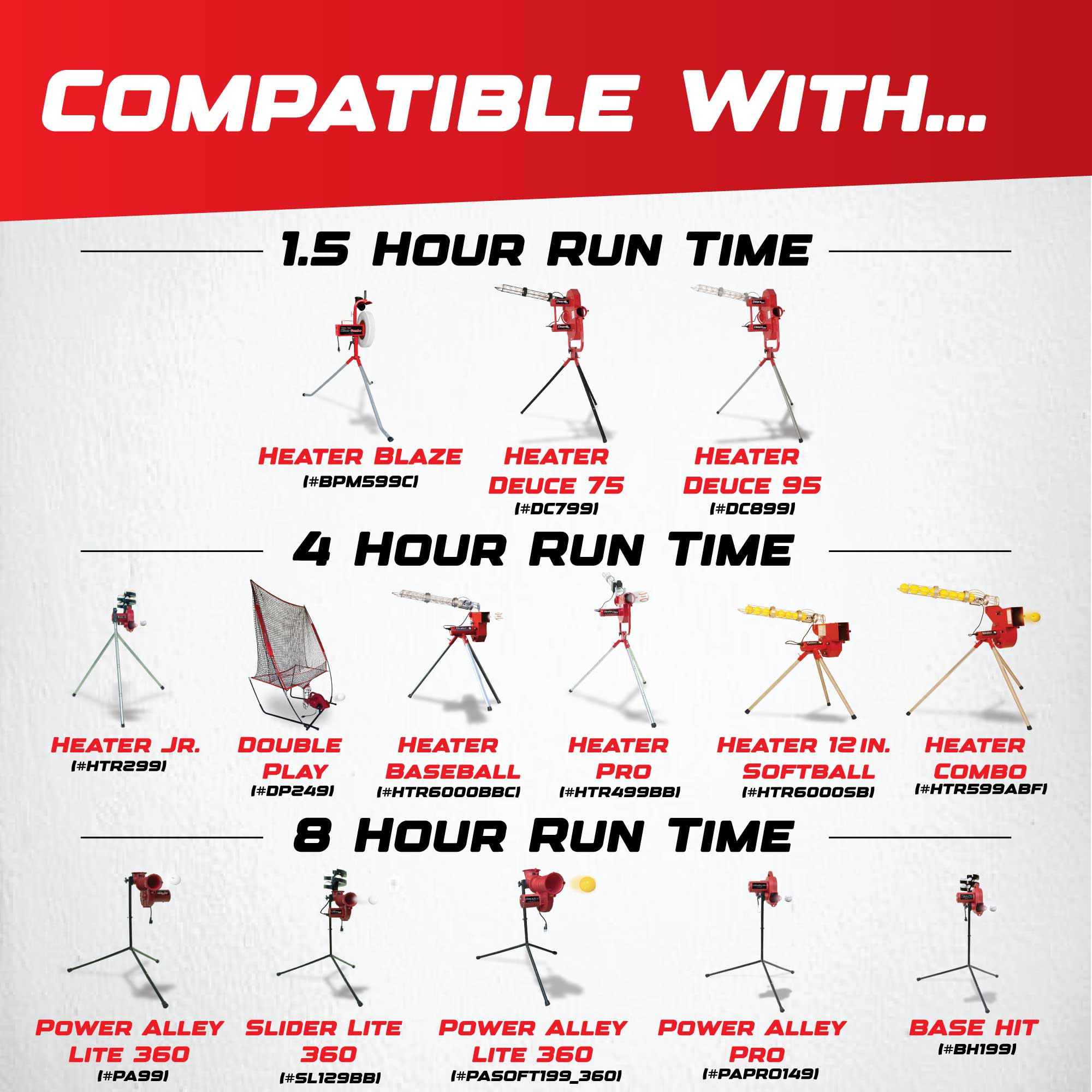 The Hot Box 1200 is designed to run the following Heater pitching machines for 3 hours ran consistently on a full charge: