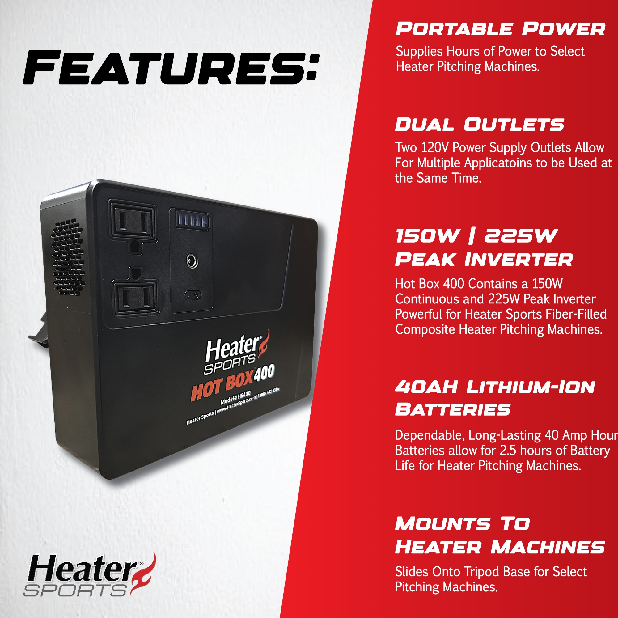 Hot Box 400 includes dual A/C outlets to plug your pitching machine into and a simple on/off switch to power it up.