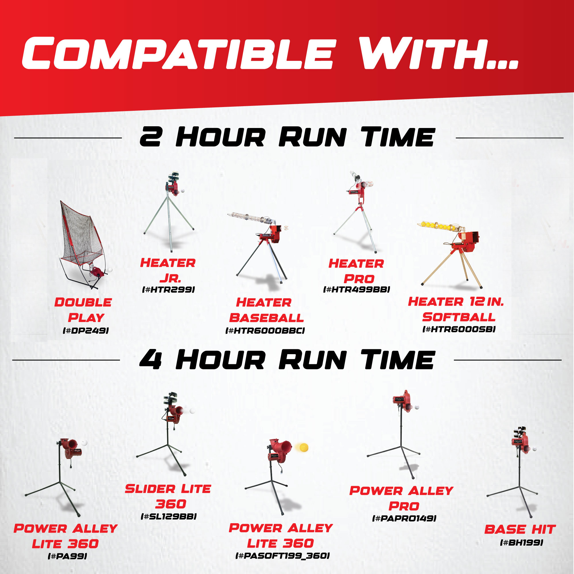 The Hot Box 600 is designed to run the following Heater pitching machines for 4 hours ran consistently on a full charge: